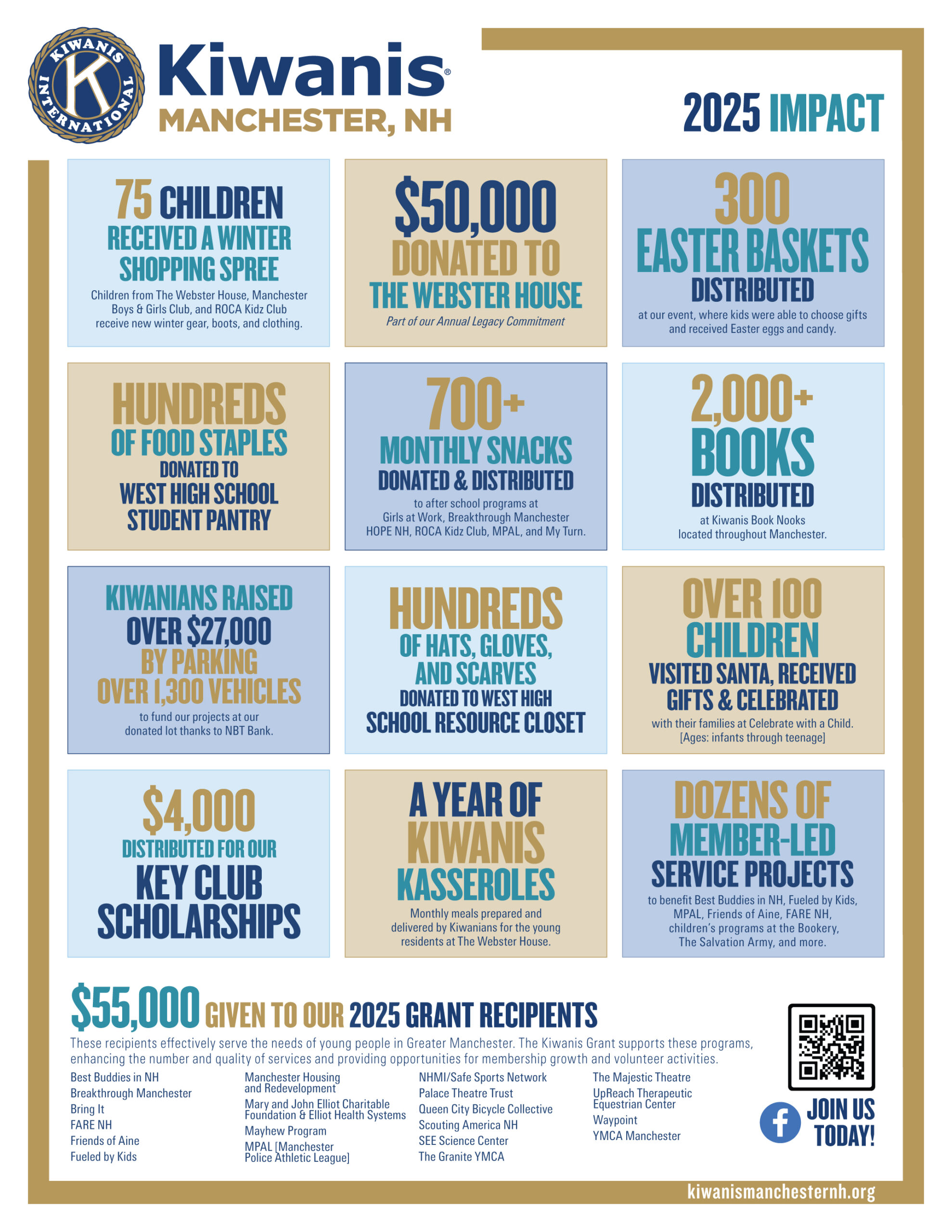 Kiwanis Club of Manchester (NH) is a group of community-oriented people dedicated to enhancing, enriching and improving the lives of children and youth in our city. We do this through community service projects, fundraising efforts, and partnerships with area schools and organizations. Kiwanis Club of Manchester was founded in 1921 and has been serving the community for over 100 years; check out our 100th Anniversary Booklet.